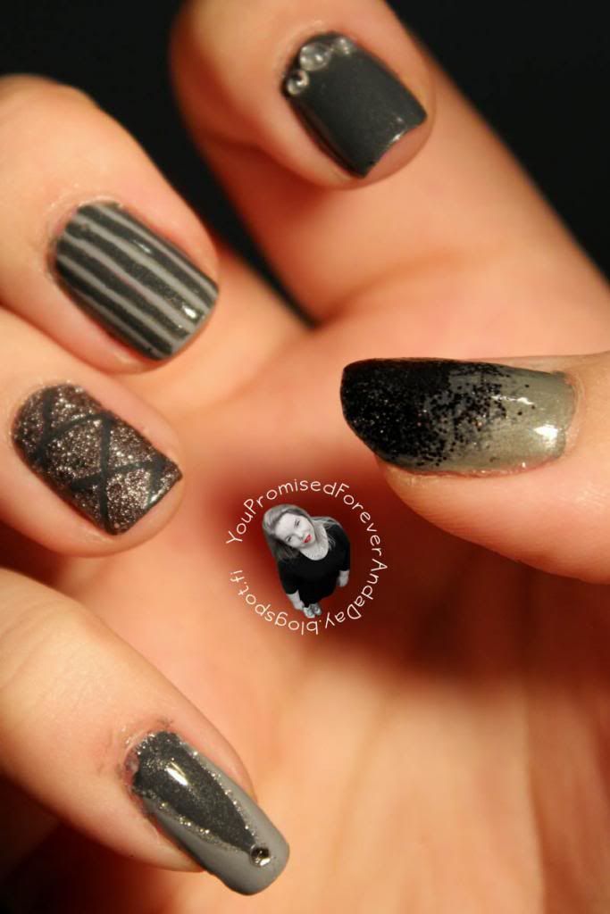 Yritin ottaa mahollisimman monta kuvaa näistä kynsistä, että toi tumman harmaan shimmeri näkyis kunnolla. Taisinki saada sen vangittua ihan kivasti, muutamaan kuvaan.